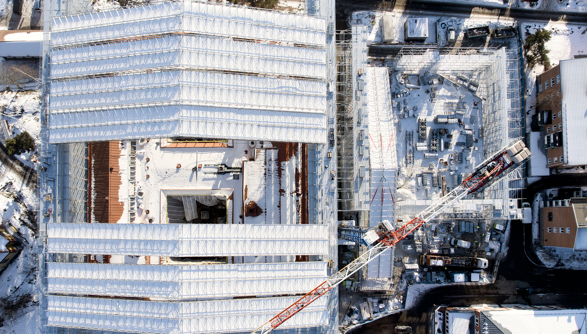 Runt kommunhuset har ett omfattande ställnings- och väderskyddssystem byggts upp. På drygt två månader har cirka 1 000 ton material monterats i en konstruktion som når upp till 40 meter över mark.