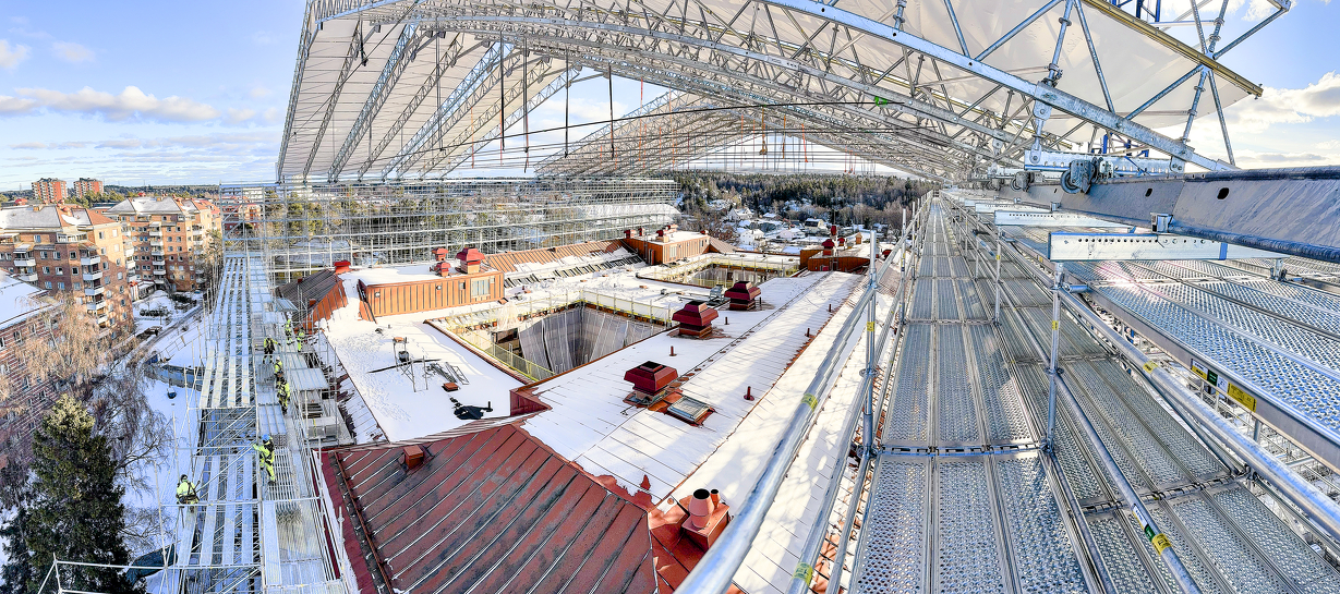 Samtidigt har projektet ett stort fokus på återbruk. Tegel demonteras, rengörs och återmonteras, och befintlig inredning tas tillvara. Vårt väderskydd skapar förutsättningarna för att detta ska kunna genomföras under kontrollerade former.