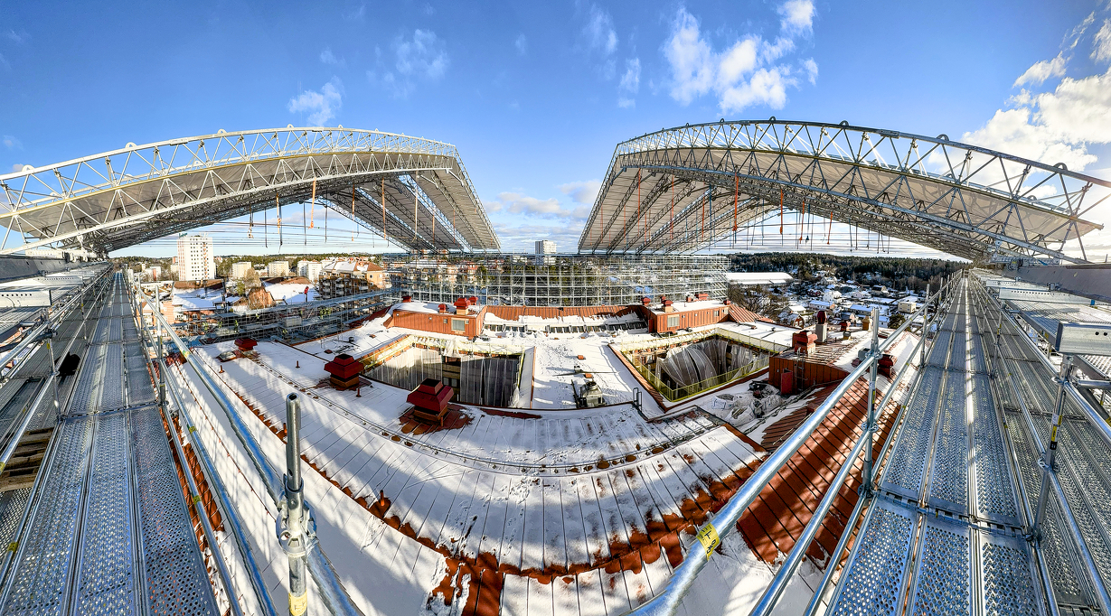 När Huddinge kommun bygger om en befintlig byggnad till kommunhus och lägger till två våningsplan och samtidigt genomför en omfattande nyproduktion av biblioteket handlar det inte om ett standardprojekt. Det är ett av de mest krävande och tekniskt komplexa uppdrag vi genomfört och Sveriges största väderskydd.