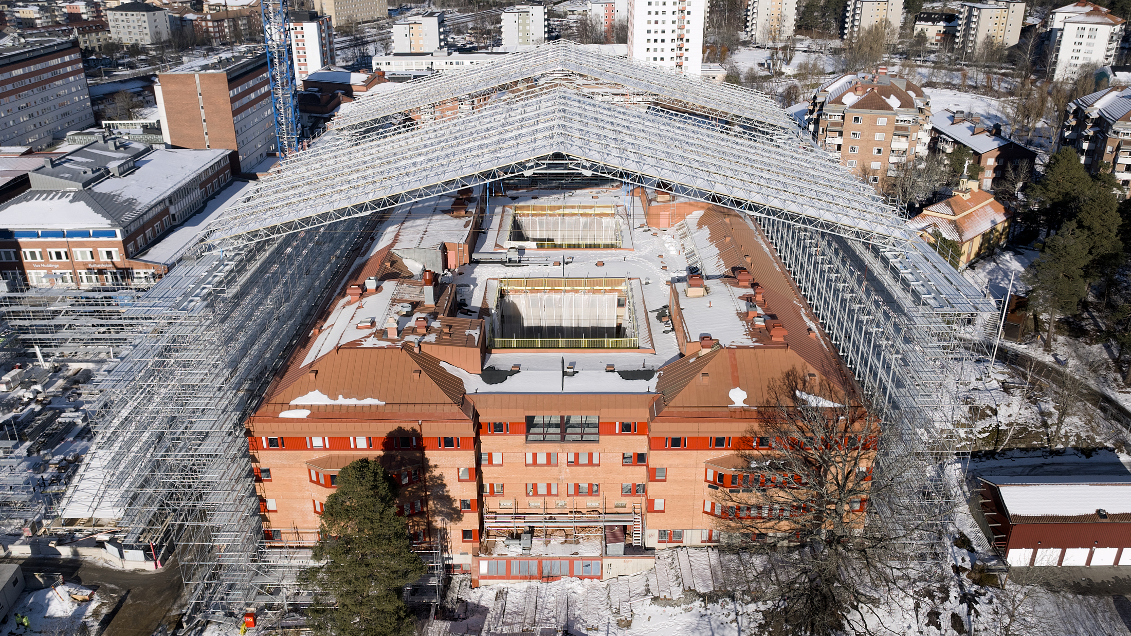 Runt kommunhuset har ett omfattande ställnings- och väderskyddssystem byggts upp. På drygt två månader har cirka 1 000 ton material monterats i en konstruktion som når upp till 40 meter över mark.
