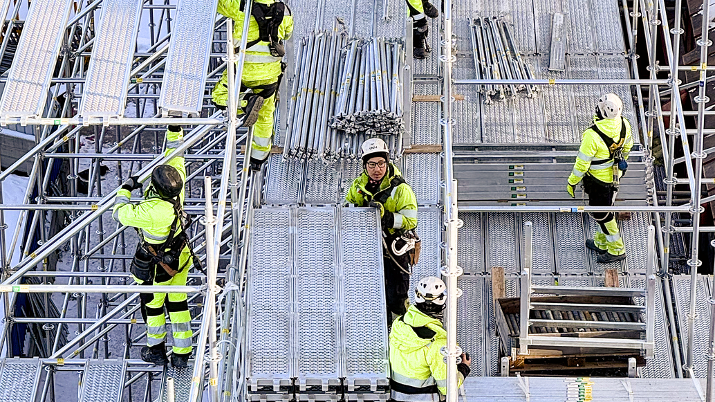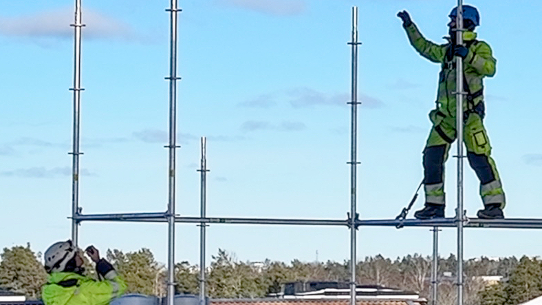 Ställningen når i snitt cirka 30 meter över mark och upp till 40 meter vid nocken. Projektet har dessutom genomförts under en ovanligt kall och snörik period, vilket förstärkt kraven på säkerhet, arbetsmiljö och daglig planering.